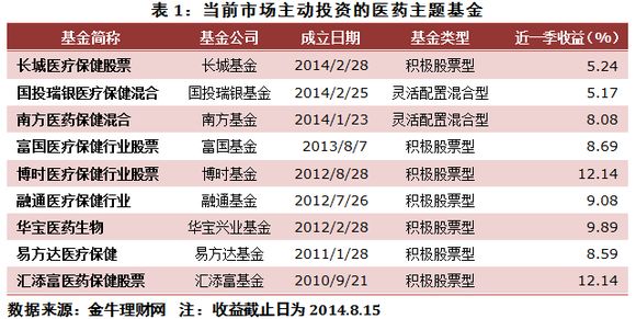 今年以來,盡管市場震蕩,成長股起伏,藍籌席卷,醫(yī)藥醫(yī)療主題基金卻始終能抗住風浪,穩(wěn)健前行。進入2014年,在政策大力扶植和行業(yè)基本面優(yōu)異的背景下,這一主題大家庭又新添了3位成員,分別為南方醫(yī)藥保健混合、國投瑞銀醫(yī)療保健混合、長城醫(yī)療保健股票。目前,市場上主動投資的醫(yī)藥醫(yī)療主題基金已達到9只。